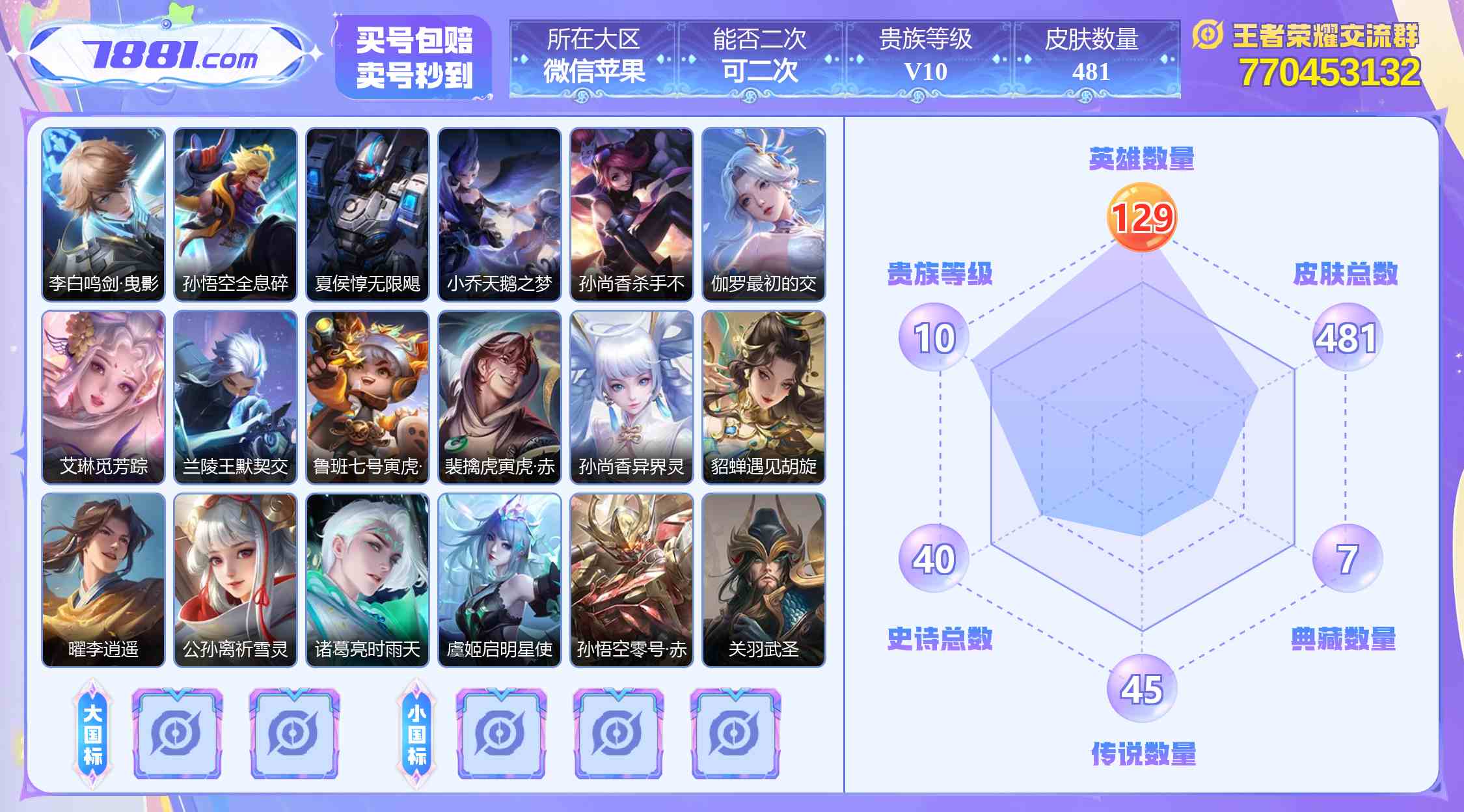 【V10 最强王者 英雄数量:129 皮肤数量:477 荣耀典藏:7个 星传说:4个 传说皮肤:45个 稀有限定:46个 皮肤价值:470678】诚心卖