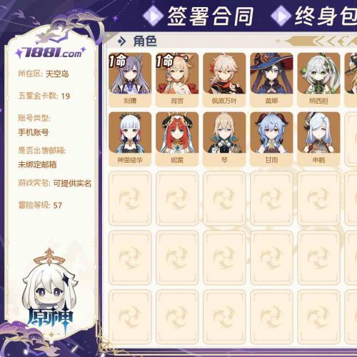 【等级:57 金卡数量:19 五星角色:12个 1命刻晴,1命宵宫,0命莫娜,0命琴,0命钟离,0命甘雨,0命枫原万叶,0命神里绫华,0命申鹤,0命妮露,0命纳西妲,0命娜维娅 五星武器:5个 精1无工之剑,精1