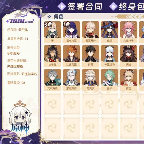 【等级:58 金卡数量:31 五星角色:20个 3命琴,1命雷电将军,0命夜兰,0命刻晴,0命迪卢克,0命莫娜,0命阿贝多,0命钟离,0命达达利亚,0命胡桃,0命枫原万叶,0命神里绫华,0命宵宫,0命八重神子,0命纳西妲,0命艾尔海森,