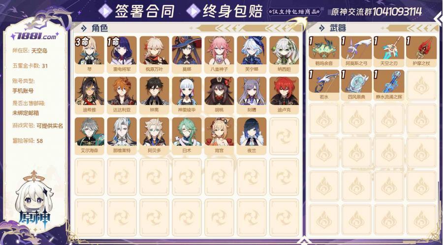 【等级:58 金卡数量:31 五星角色:18个 2命刻晴,2命琴,2命魈,2命神里绫华,1命夜兰,1命七七,0命迪卢克,0命莫娜,0命温迪,0命可莉,0命胡桃,0命枫原万叶,0命雷电将军,0命八重神子,0命提纳里,0命纳西妲,0命流浪者,0命迪希雅 五星武器:3个 精1若水,精1