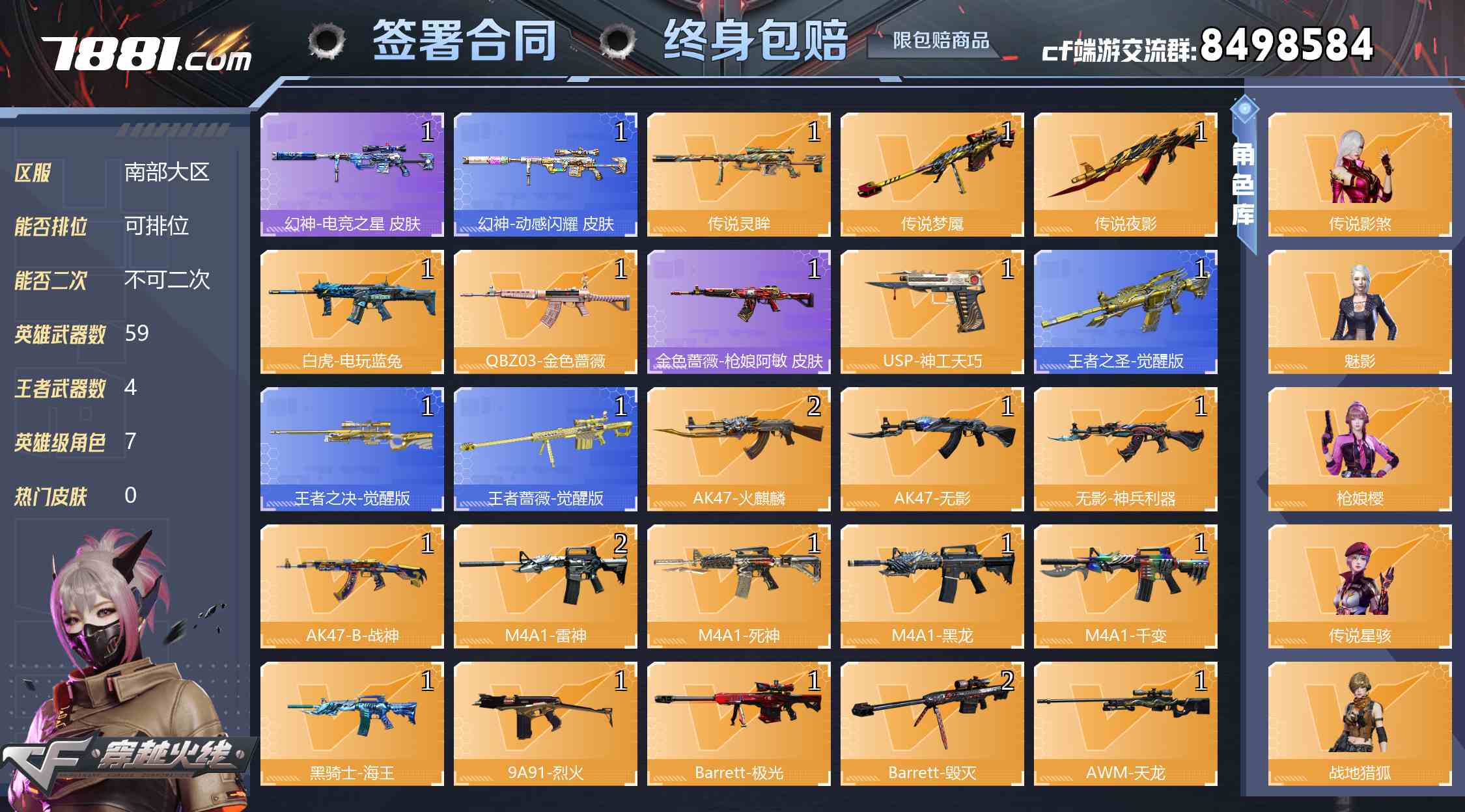 【不可二次 英雄武器数量:59 英雄角色数量:7 王者武器数量:4 传说影煞,传说星骇 枪娘樱,战地猎狐,魅影 幻神-动感闪耀 皮肤,幻神-电竞之星 皮肤 金色蔷薇-枪娘阿敏 修罗-15周年,修罗-CFSTAR,战神-粉色甜心,天龙-CFSTAR,无影耀金,无影-神兵利器,AK47-B-常胜将军-曹操,屠龙-春桃 传说灵眸,传说圣谕,传说梦魇,传说夜影 稀有武器:13个 爆破号】6个传说级
