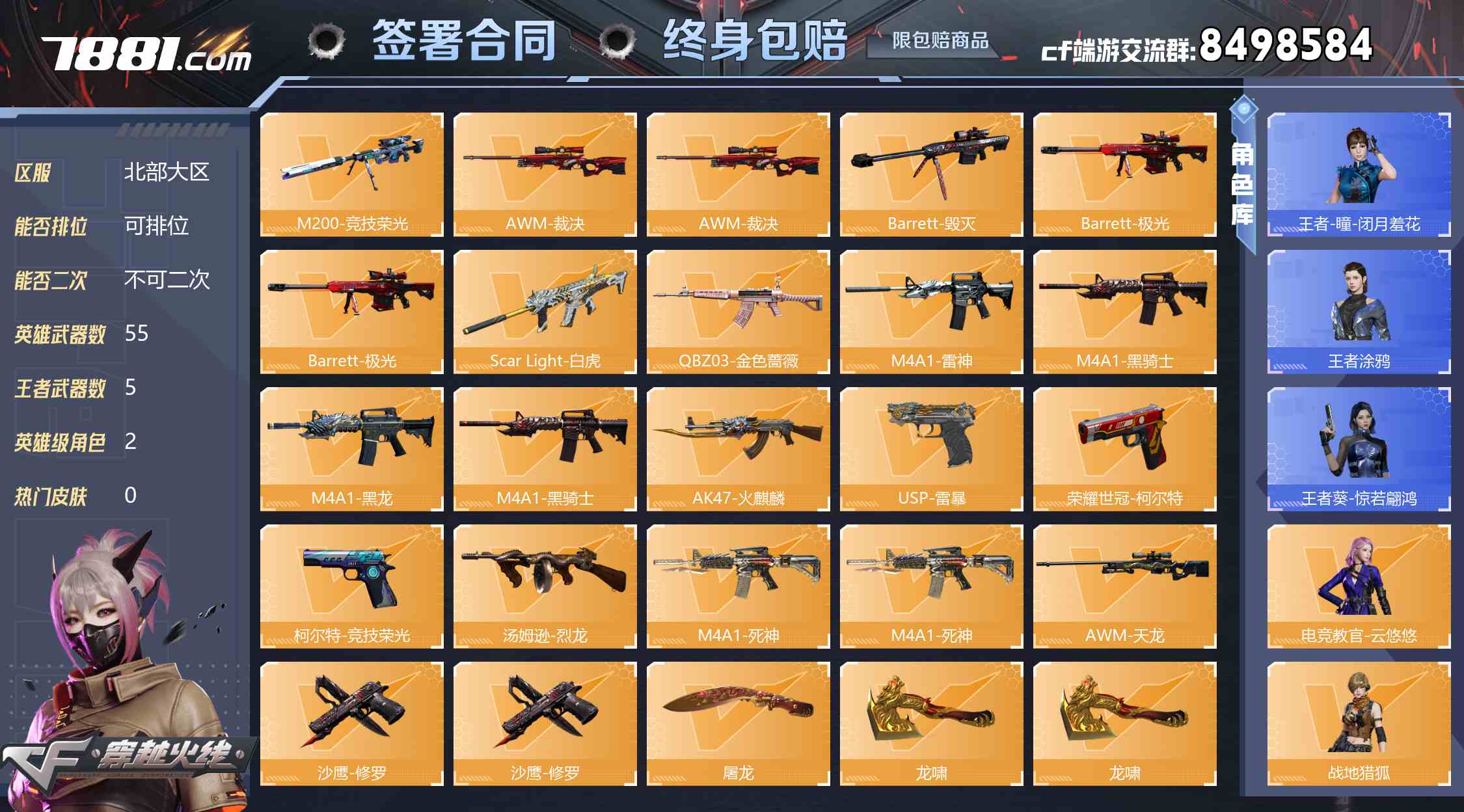 【不可二次 英雄武器数量:54 英雄角色数量:2 王者武器数量:5 王者-瞳-闭月羞花,王者涂鸦,王者葵-惊若翩鸿 电竞教官-云悠悠,战地猎狐,兰-海滩派对,葵-赛博朋克 Barrett-毁灭音效卡,M4A1-雷神音效卡,Barrett-极光音效卡 屠龙-荣耀之锋,屠龙-荣耀世冠AG,修罗-冠军之魂,修罗-CFSTAR 稀有武器:9个 爆破号】