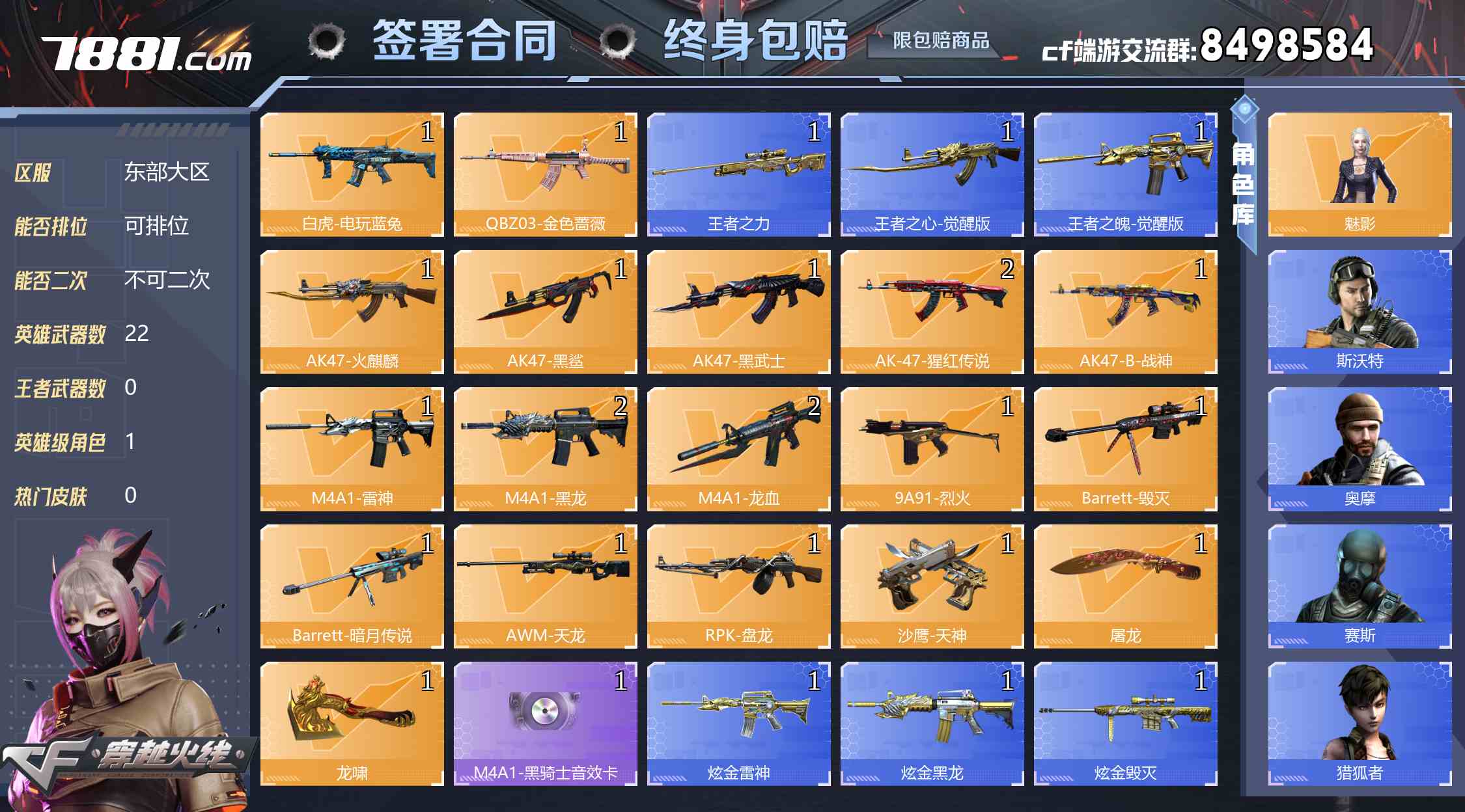 【不可二次 英雄武器数量:22 英雄角色数量:1 王者武器数量:0 魅影 M4A1-黑骑士音效卡 AK47-B-常胜将军-曹操 稀有武器:8个 爆破号】1200