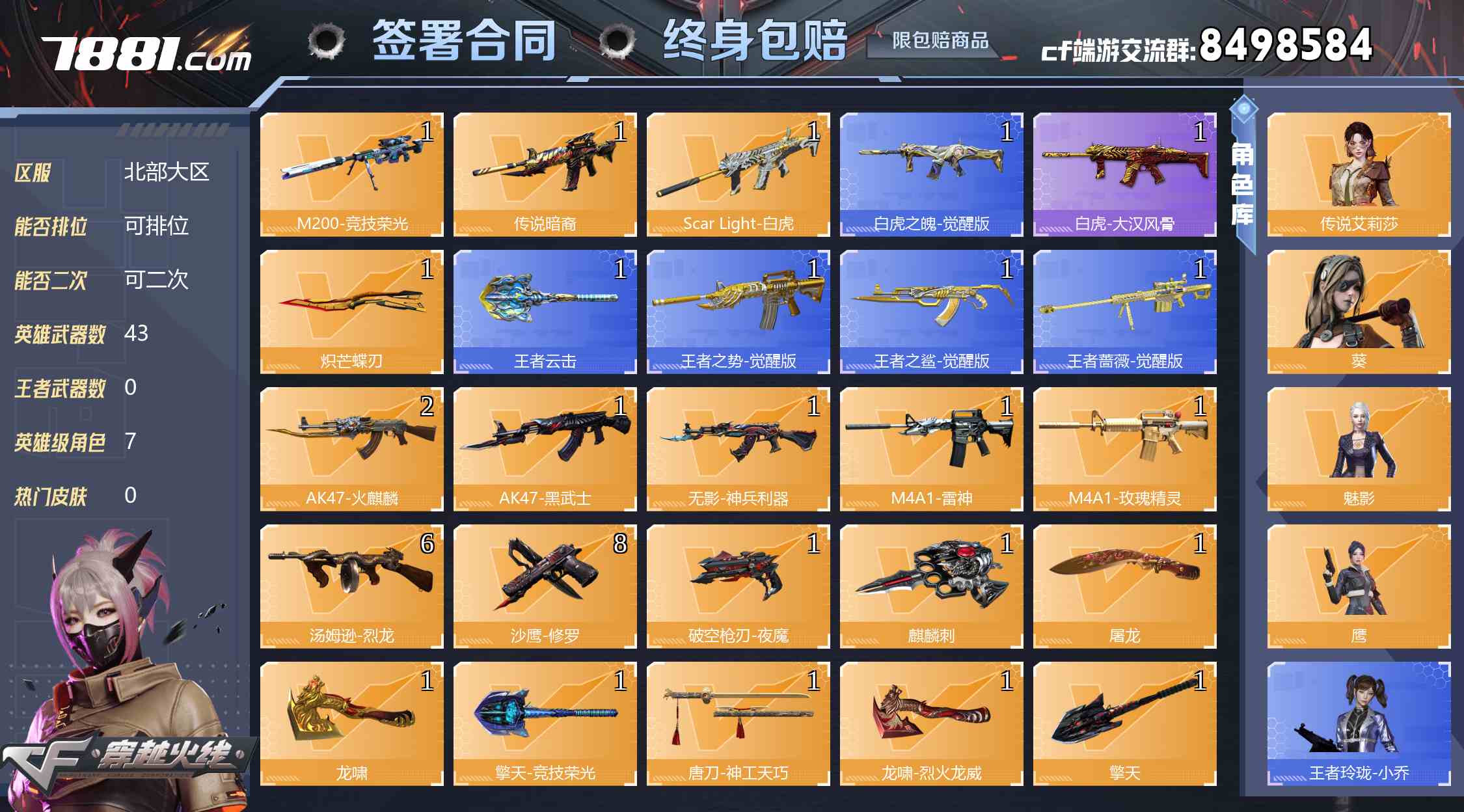 【可二次 英雄武器数量:43 英雄角色数量:7 王者武器数量:0 葵-赛博朋克,晴雅,电竞教官-云悠悠,炽天使,魅影,关小雨,鹰,职业选手 M4A1-黑骑士音效卡,绝迹语音包 白虎-大汉风骨 修罗-冠军之魂,龙啸-冠军之啸,无影-神兵利器,屠龙-荣耀之锋 传说暗裔 稀有武器:10个 六盘龙】不想玩了