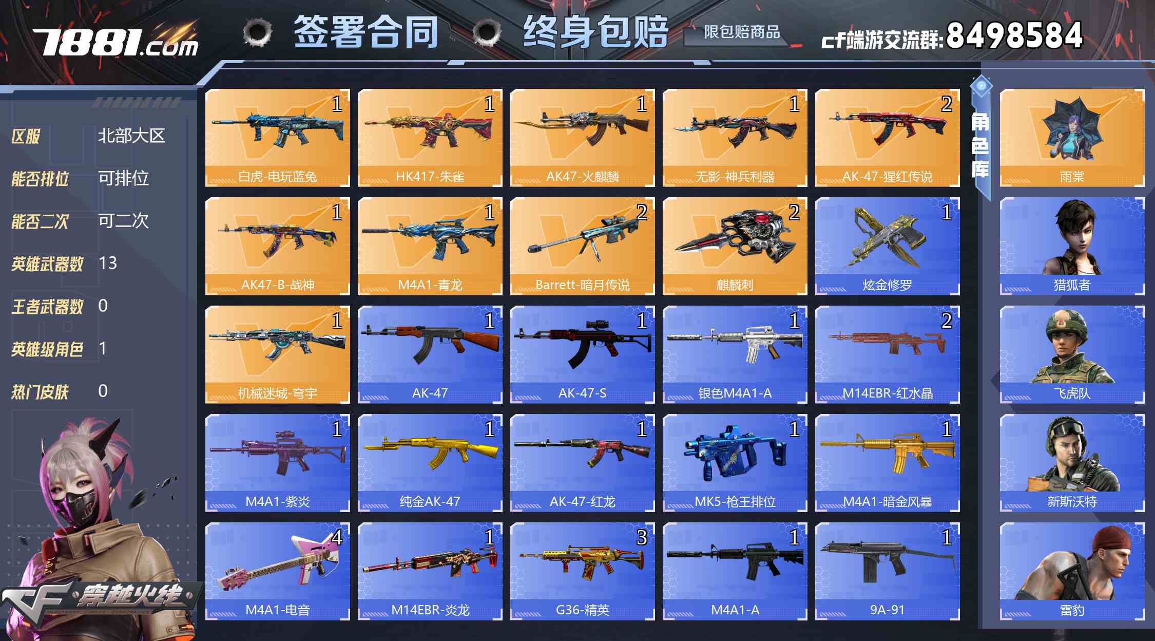 【可二次 英雄武器数量:13 英雄角色数量:1 王者武器数量:0 雨棠 修罗-CFSTAR,AK47-B-常胜将军-孙权,无影-神兵利器,AK47-B-常胜将军-曹操 稀有武器:4个 爆破号】