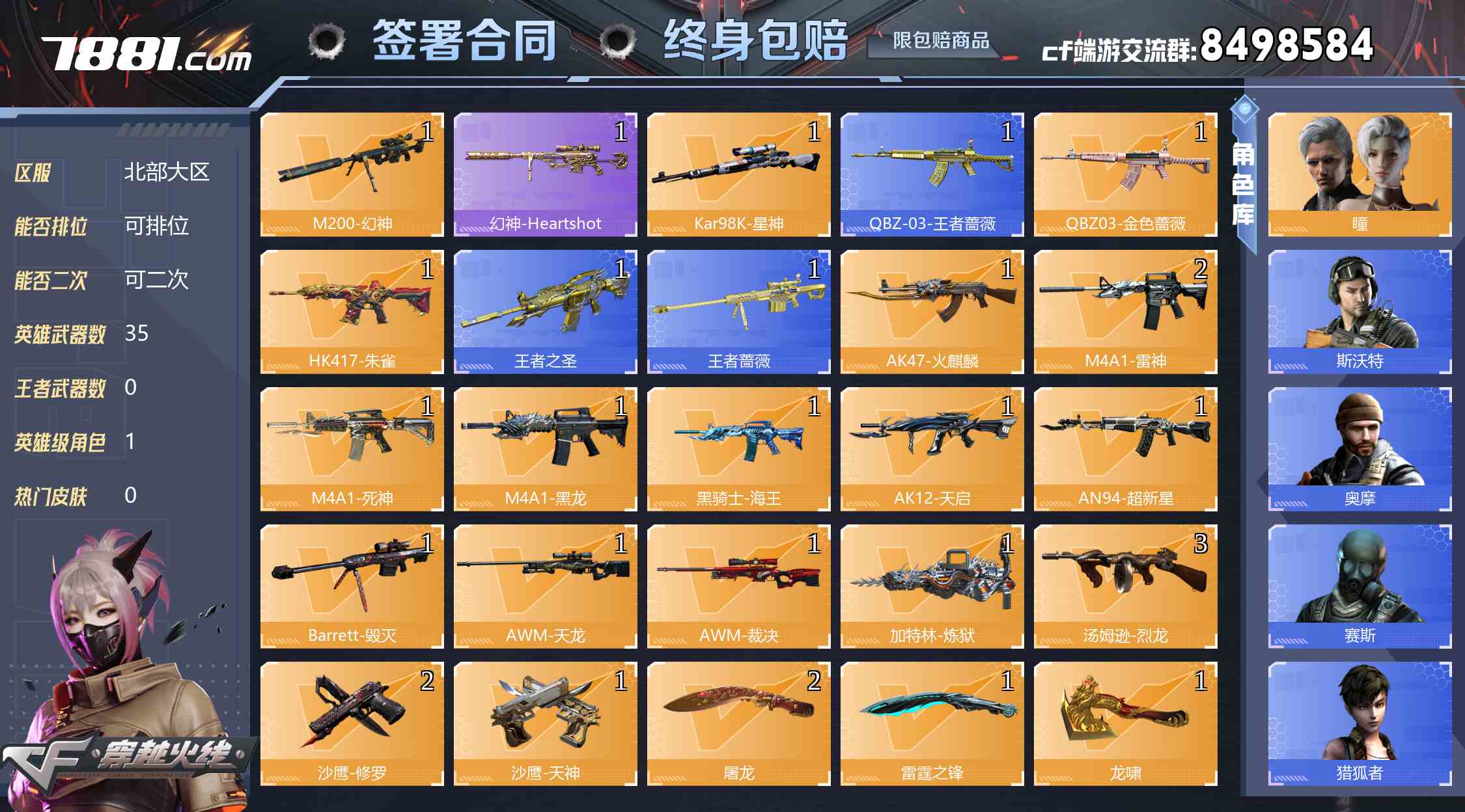 【可二次 英雄武器数量:35 英雄角色数量:1 王者武器数量:0 修罗-CFSTAR 稀有武器:10个 爆破号】
