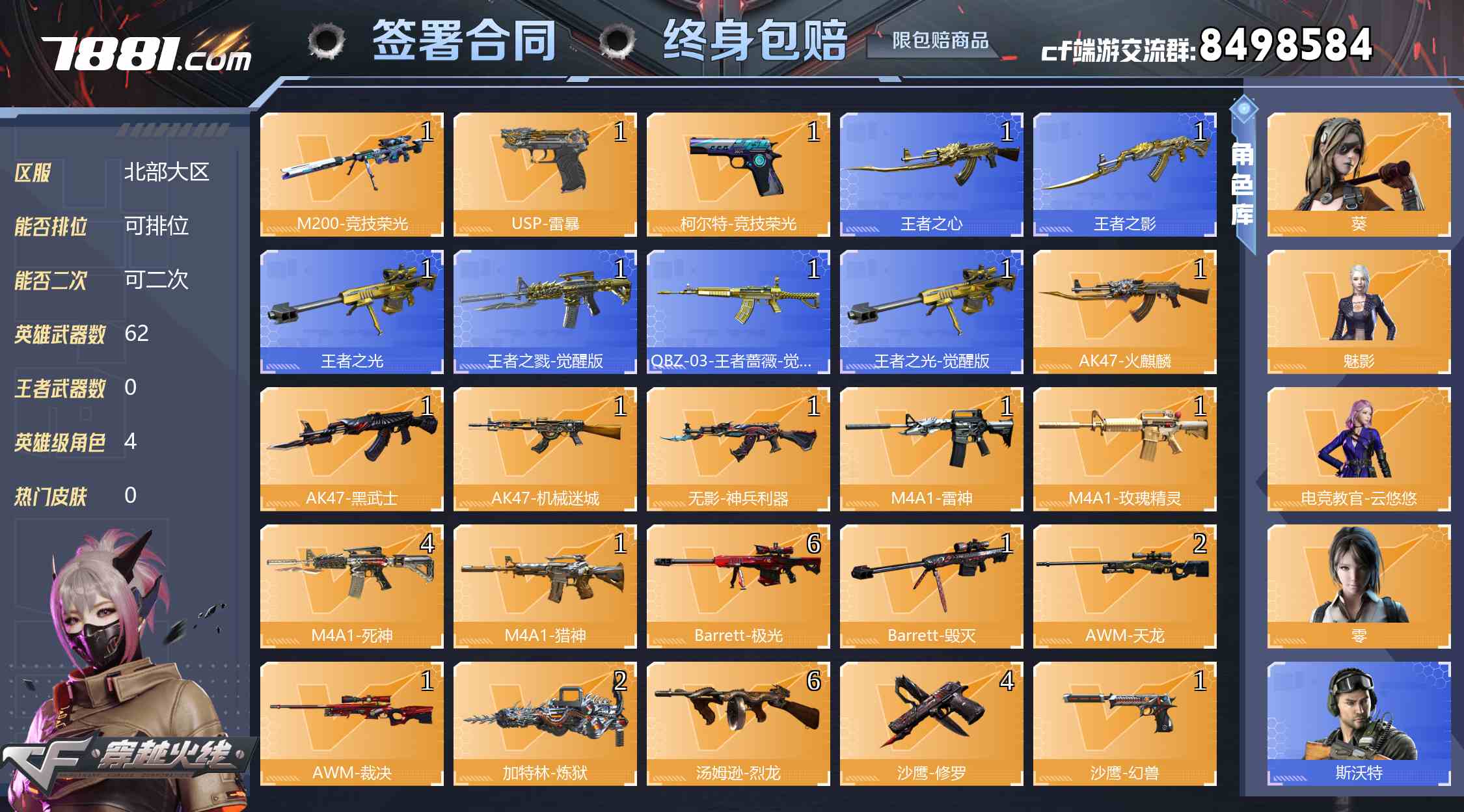 【可二次 英雄武器数量:62 英雄角色数量:4 王者武器数量:0 狐影 电竞教官-云悠悠,魅影,零 Barrett-毁灭音效卡 无影-神兵利器 稀有武器:16个 六烈龙,爆破号】诚心卖