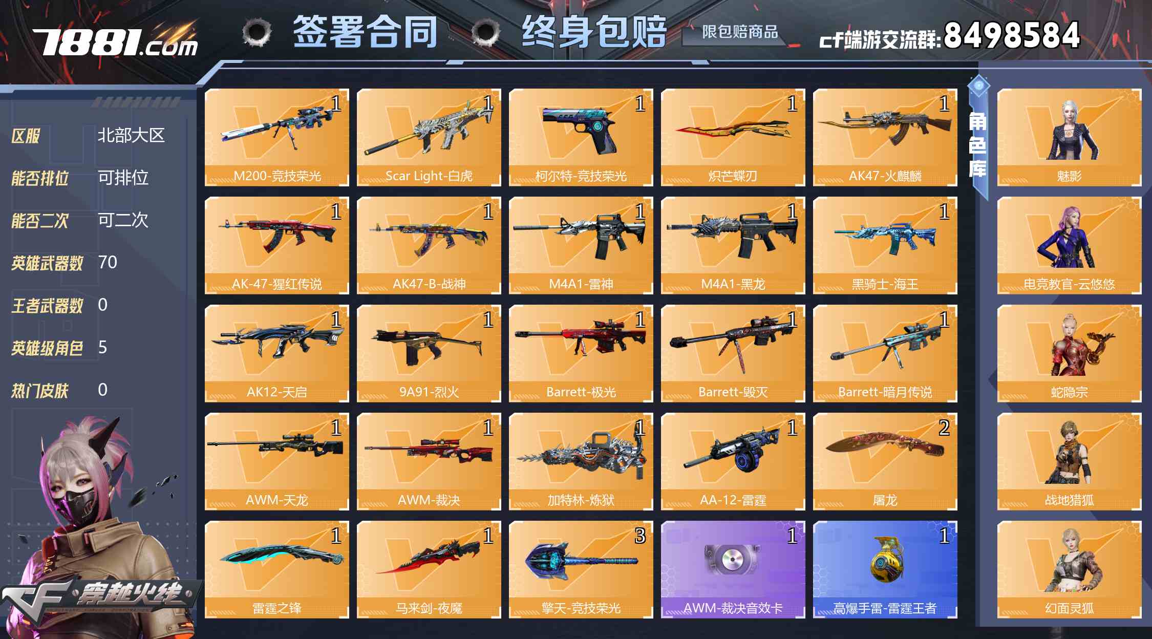 【可二次 英雄武器数量:70 英雄角色数量:5 王者武器数量:0 电竞教官-云悠悠,零-热舞青春,魅影,战地猎狐 AWM-裁决音效卡 修罗-CFSTAR,天龙-CFSTAR 稀有武器:9个 爆破号】白虎 玄豹 魅影 炽芒蝶刃