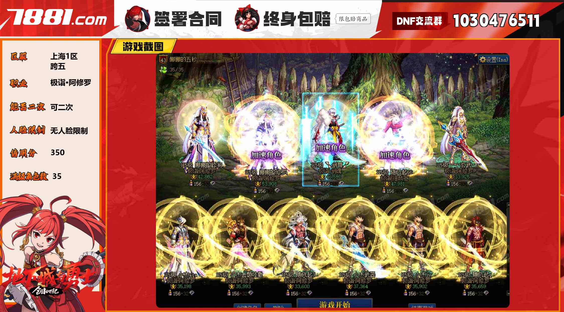 【主职业: 极诣·阿修罗 次要职业: 极诣·剑魂 一年内有制裁记录 可二次 无人脸限制 时装:神器天空 信用分:350 满级角色数:35 主角色名望值:59000 破凶阶段:已破凶 毕业武器:增幅11 增幅0-9:11件 增幅10:6件 增幅11:2件 增幅12:2件 至尊称号:破茧·三次觉醒-2023 至尊宠物:太初之赛丽亚-2023】2023年战败号,20套年套,35个角色都是年套宠物称号