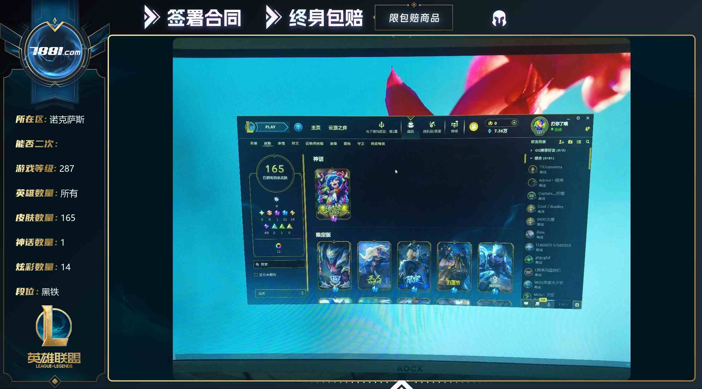 【不可二次 等级:225 英雄数量:全英雄 皮肤数量:178 神话数量:1 炫彩数量:14】171英雄皮肤,(***)该编号逆战王者一体出