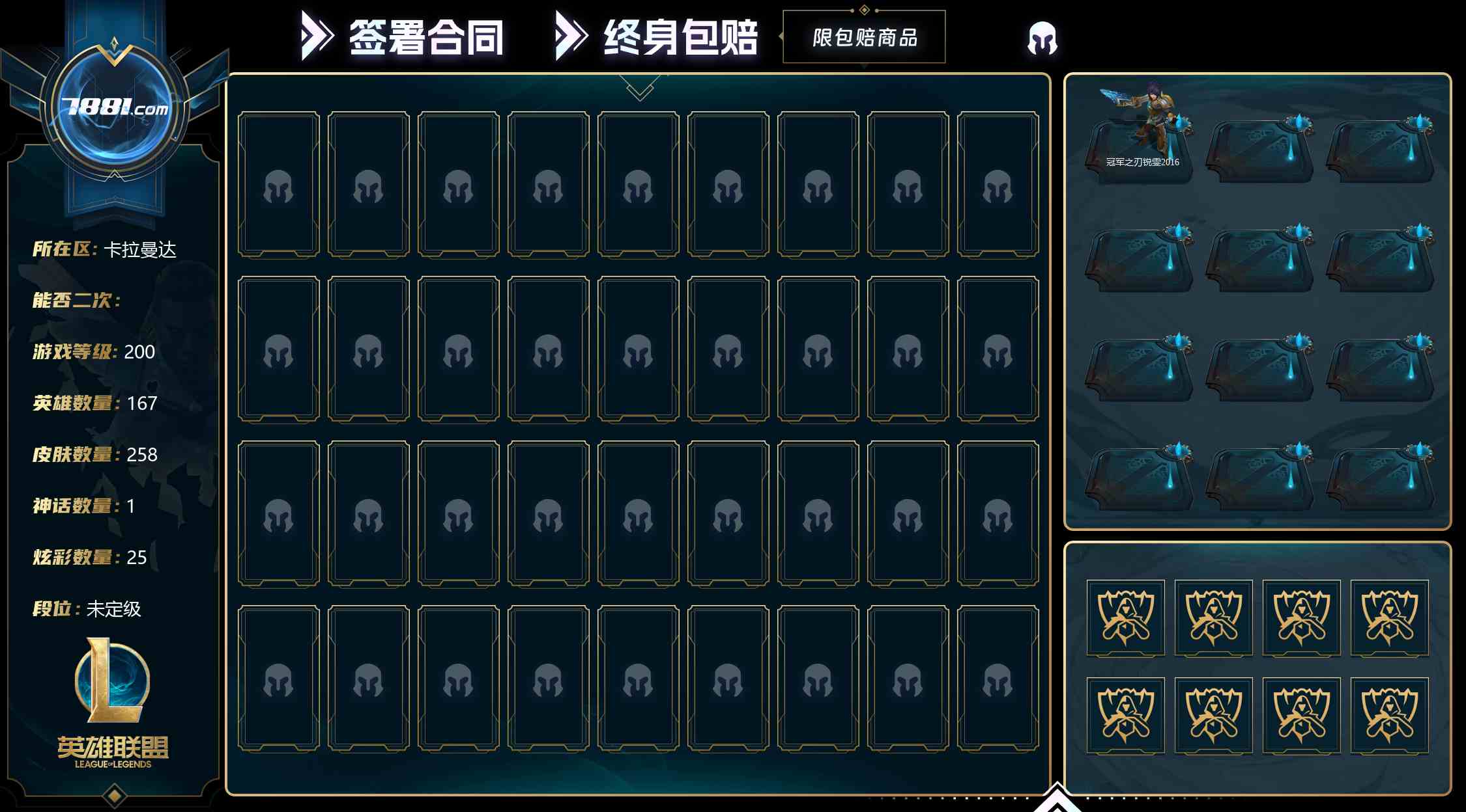 【可二次 等级:200 英雄数量:167 皮肤数量:258 神话数量:1 炫彩数量:25 冠军之刃锐雯2016】英雄联盟账号出售