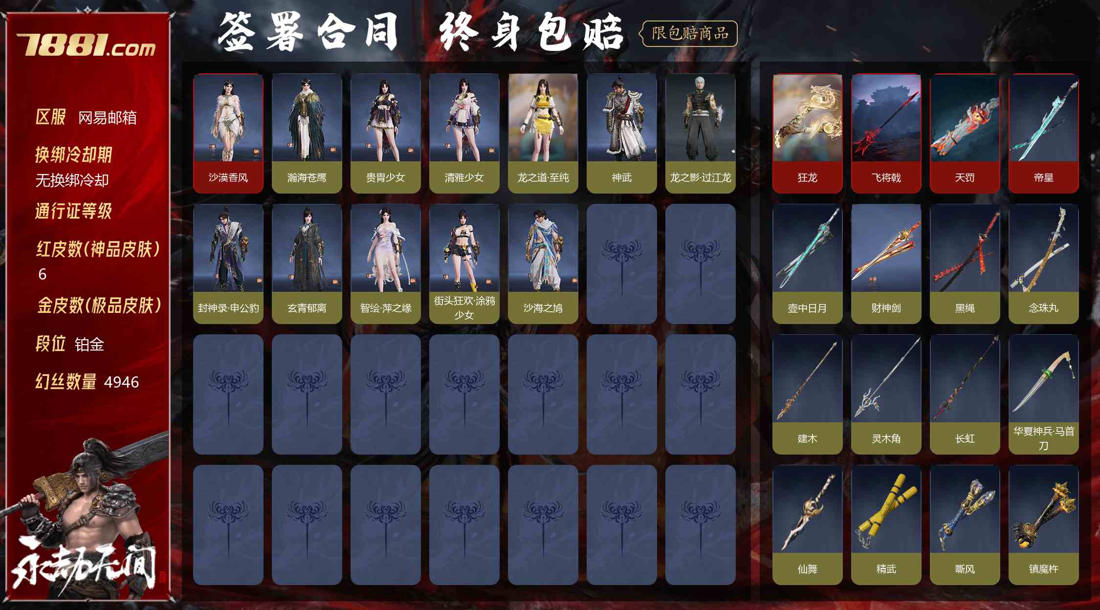 【最高段位:铂金 红皮数:6 幻丝数:4946 迦南:2个 瀚海苍鹰,沙漠香风 胡桃:3个 龙之道·至纯,清雅少女,贵胄少女 顾清寒:1个 玄青郁离 殷紫萍:1个 沈妙:1个 岳山:2个 龙之影·过江龙,神武 无尘:1个 封神录·申公豹 哈迪:1个 沙海之鸠 长剑:2个