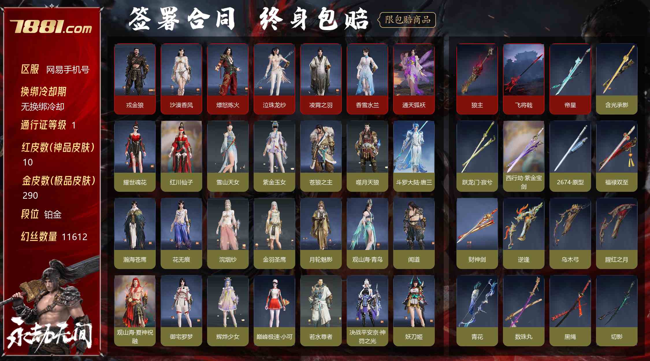 【最高段位:铂金 红皮数:10 金皮数:290 幻丝数:11612 变身器:1个 宁红夜:4个 红川仙子,雪山天女,耀世魂花,紫金玉女 席拉:1个 天虹咏 迦南:7个 沙漠香风,观山海·青鸟,瀚海苍鹰,花无痕,浣烟纱,金羽圣鹰
