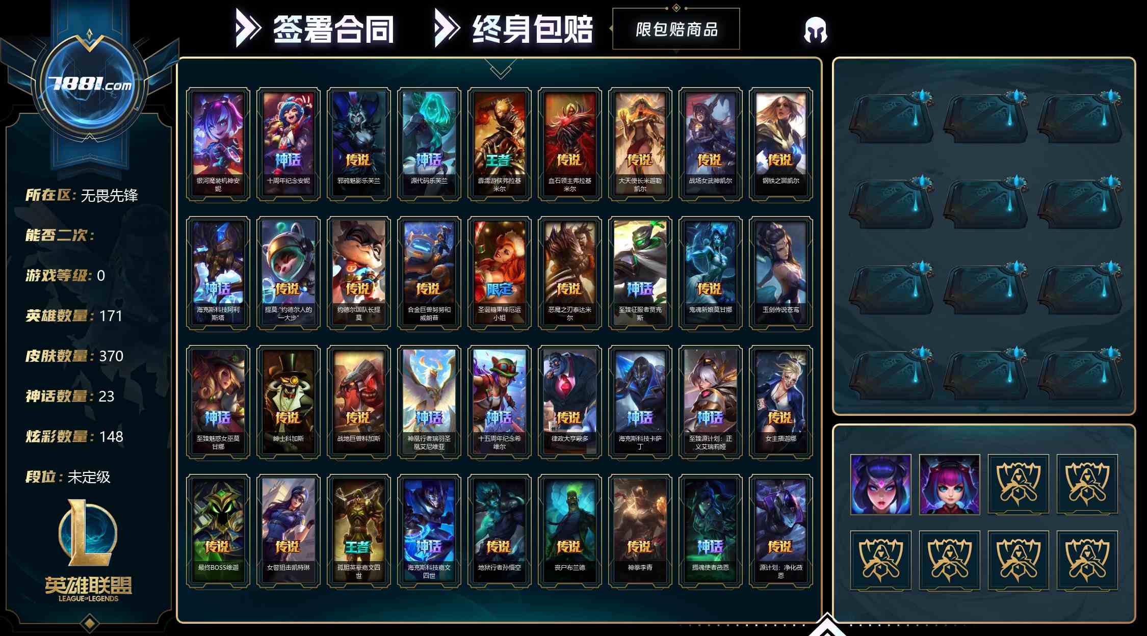 可二次 等级:0 英雄数量:171 皮肤数量:370 神话数量:23 炫彩数量:148 至臻皮肤:至臻征服者贾克斯,至臻魅惑女巫莫甘娜,至臻源计划:正义艾瑞莉娅,至臻烈焰美人薇恩,至臻烈焰美人薇恩(2022),
