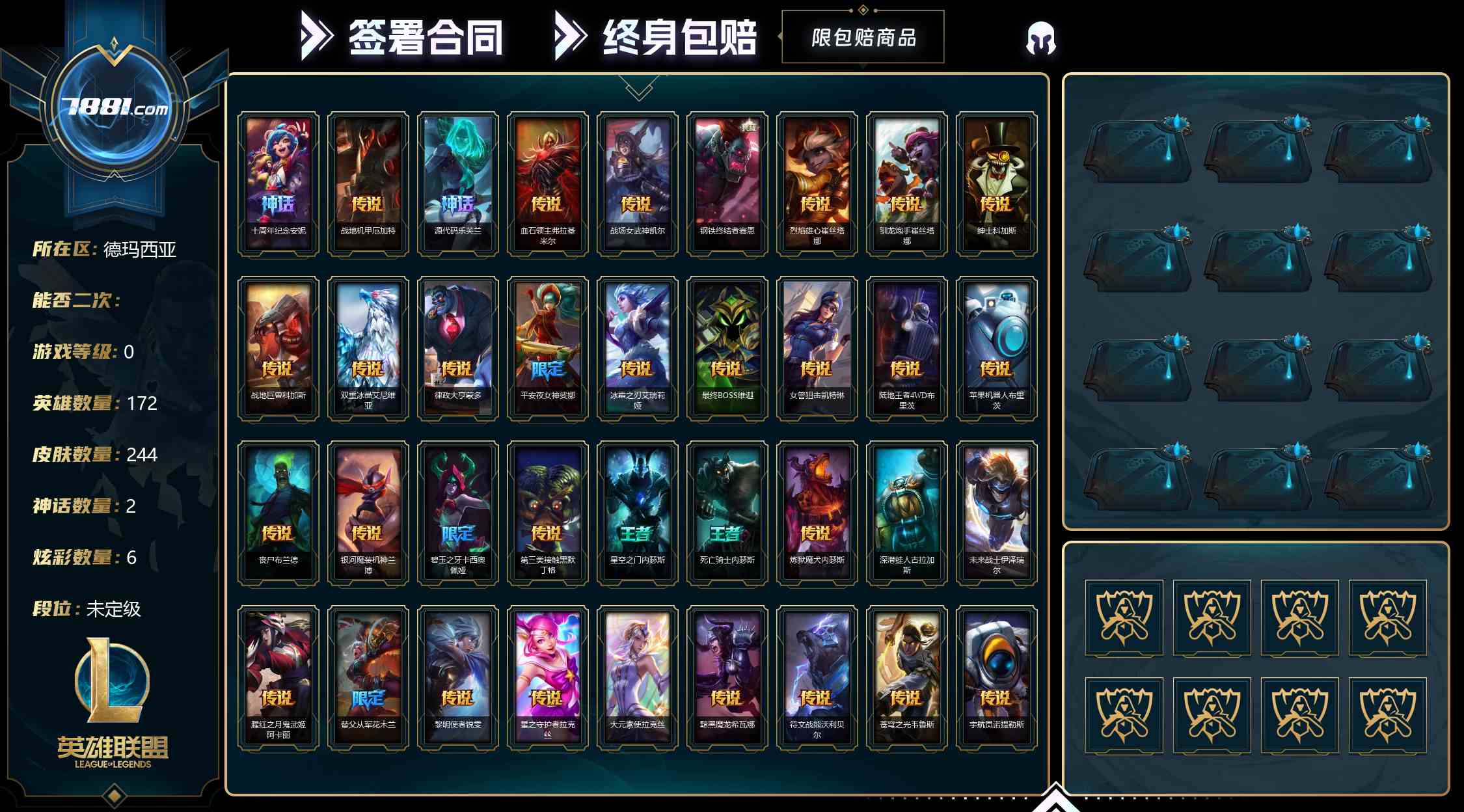 【可二次 等级:0 英雄数量:172 皮肤数量:244 神话数量:2 炫彩数量:6 大元素使拉克丝,未来战士伊泽瑞尔 十周年纪念安妮,源代码乐芙兰 战地机甲厄加特,血石领主弗拉基米尔,战场女武神凯尔,烈焰雄心崔丝塔娜,驯龙炮手崔丝塔娜