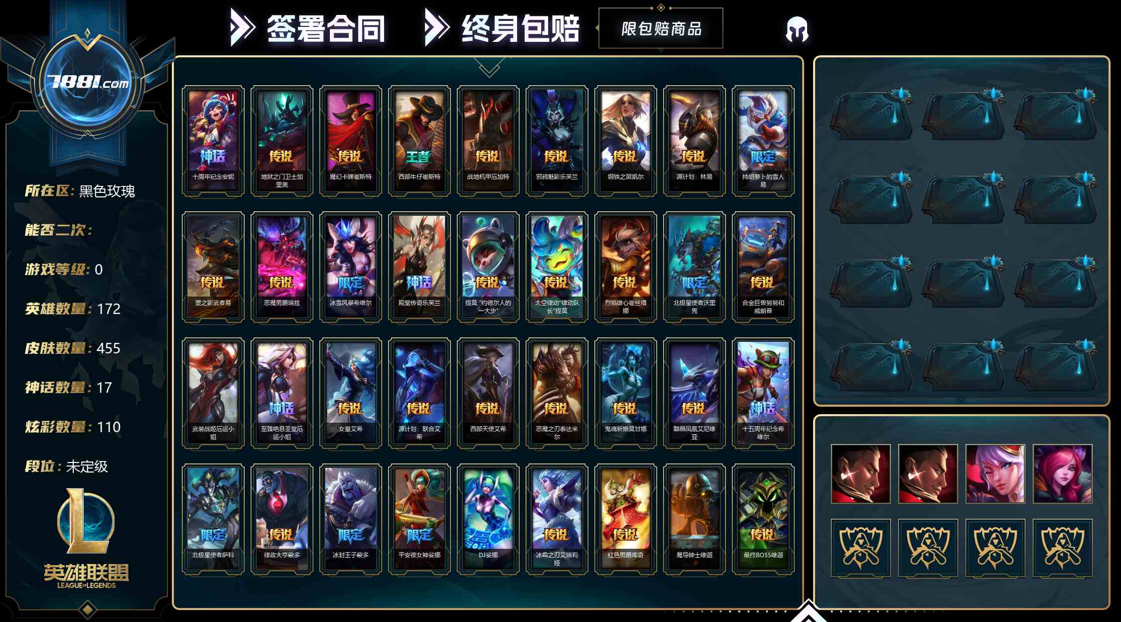 可二次 等级:0 英雄数量:172 皮肤数量:455 神话数量:17 炫彩数量:110 至臻皮肤:至臻绝息圣堂厄运小姐,至臻狼神英灵斯维因,至臻黑夜使者李青,至臻灵能特工伊泽瑞尔,至臻战斗学院蕾欧娜,至臻暗星女王黛安娜,至臻K/DAALLOUT卡莎