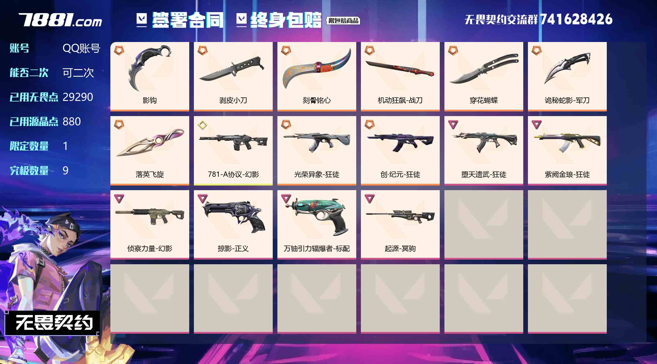 【QQ账号 可二次 可排位 已用无畏点数:29290 已用源晶点数:880 影钩,剥皮小刀,落英飞旋,刻骨铭心,机动狂飙-战刀,穿花蝴蝶,诡秘蛇影-军刀 堕天遗武-狂徒,紫阙金琅-狂徒,光荣异象-狂徒,创·纪元-狂徒