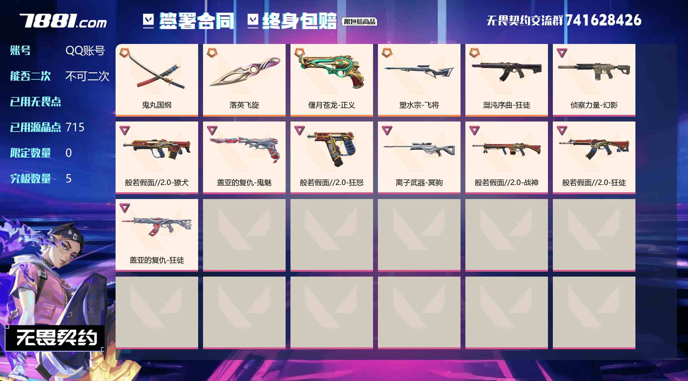 【QQ账号 不可二次 可排位 已用源晶点数:715 般若假面 落英飞旋,鬼丸国纲 混沌序曲-狂徒,般若假面//2.0-狂徒,盖亚的复仇-狂徒 侦察力量-幻影 般若假面//2.0-獠犬 偃月苍龙-正义