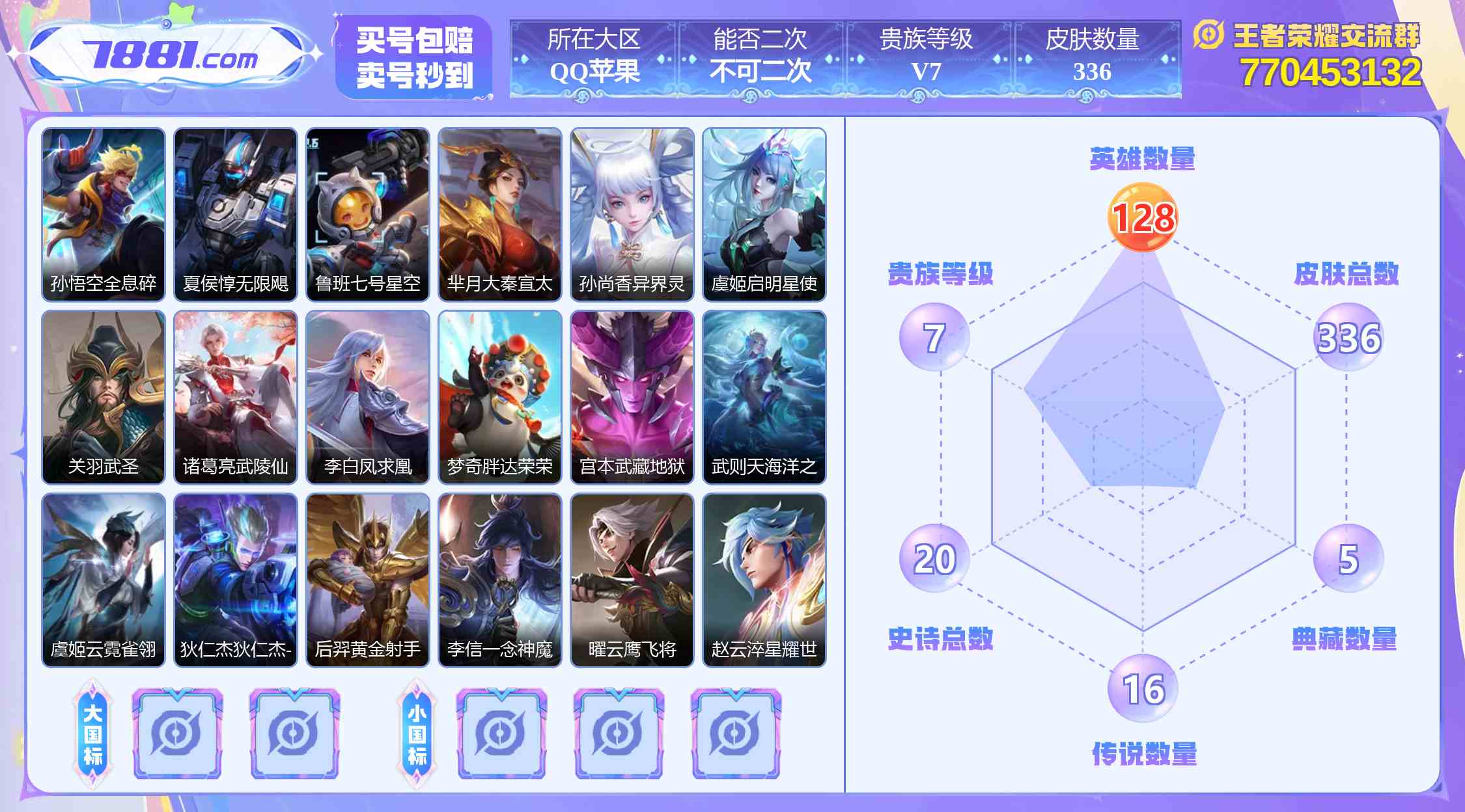 V7 非凡王者 英雄数量:128 皮肤数量:336 荣耀典藏:5个 传说皮肤:16个 稀有限定:18个 皮肤价值:298474】【WZ3499】贵族7/皮肤336/典藏4/传说16/史诗96/英雄128/刘邦全皮/孙权全皮