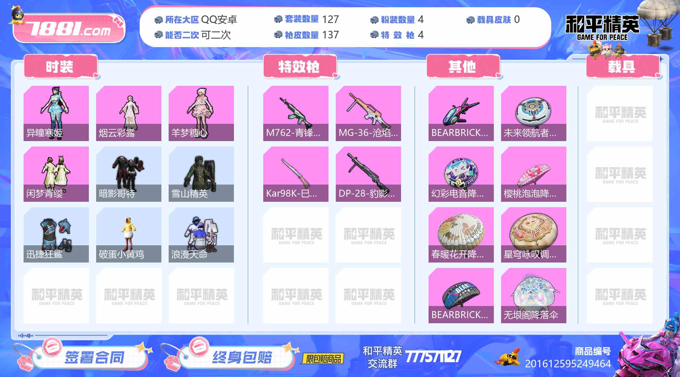 【王牌印记数量:4 套装数量:124 枪皮数量:132 粉装数量:4 特效枪数量:4 优质套装: 异瞳寒姬,烟云彩露,羊梦糖心,闲梦青缨 热门套装:5个 破蛋小黄鸡,迅捷狂鲨,浪漫天命