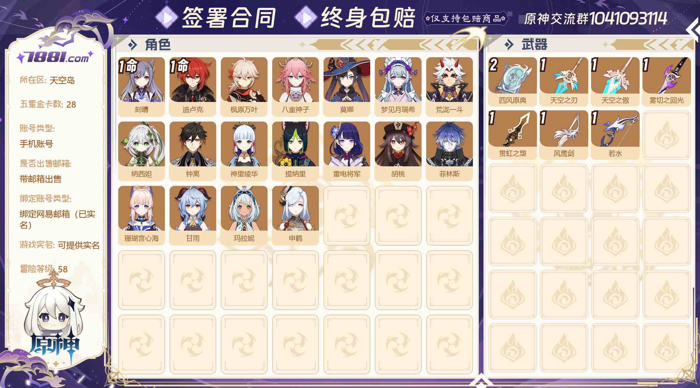 【等级:58 金卡数量:28 五星角色:18个 1命迪卢克,1命刻晴,0命甘雨,0命申鹤,0命钟离,0命荒泷一斗,0命枫原万叶,0命神里绫华,0命雷电将军,0命纳西妲,0命玛拉妮,0命珊瑚宫心海,