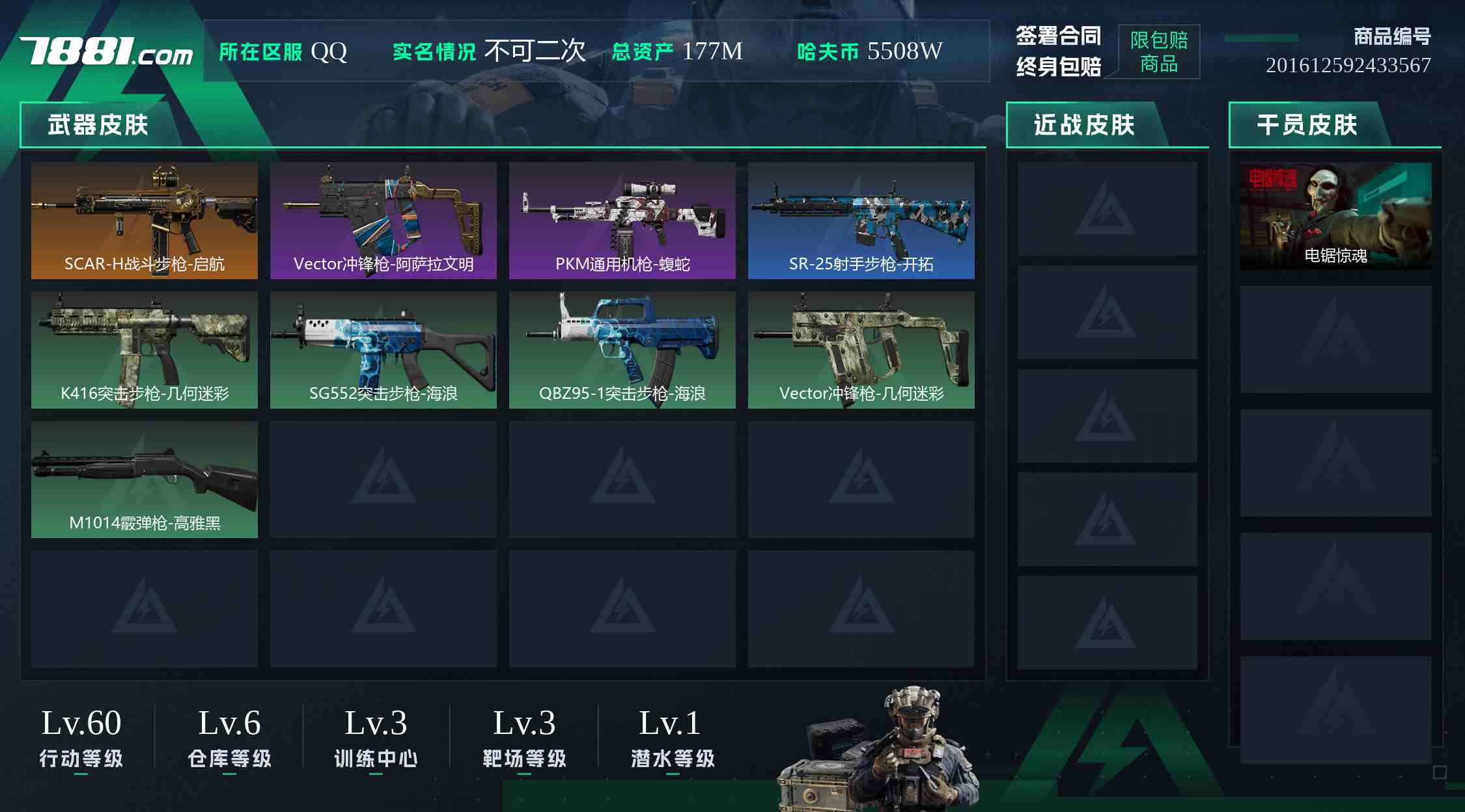 行动等级:60 总资产:177M 哈夫币:5508W 干员皮肤:电锯惊魂 三角币:0 三角券:0】编号93379 不可二次 等级60 总资产177m