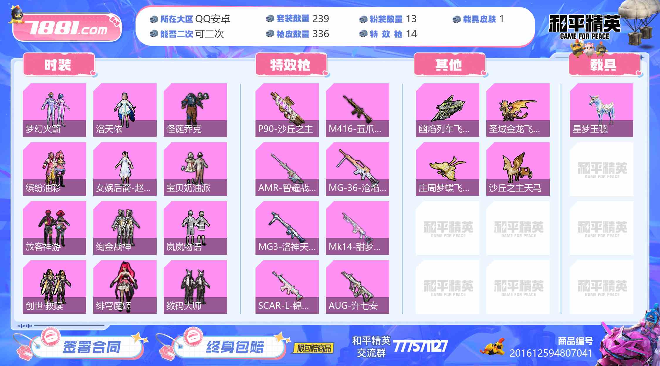 【王牌印记数量:20 套装数量:239 枪皮数量:336 粉装数量:13 特效枪数量:14 优质套装:洛天依,梦幻火箭,缤纷油彩,怪诞乔克,放客神游,绯穹魔姬,创世·救赎,女娲后裔-赵灵儿,岚岚物语