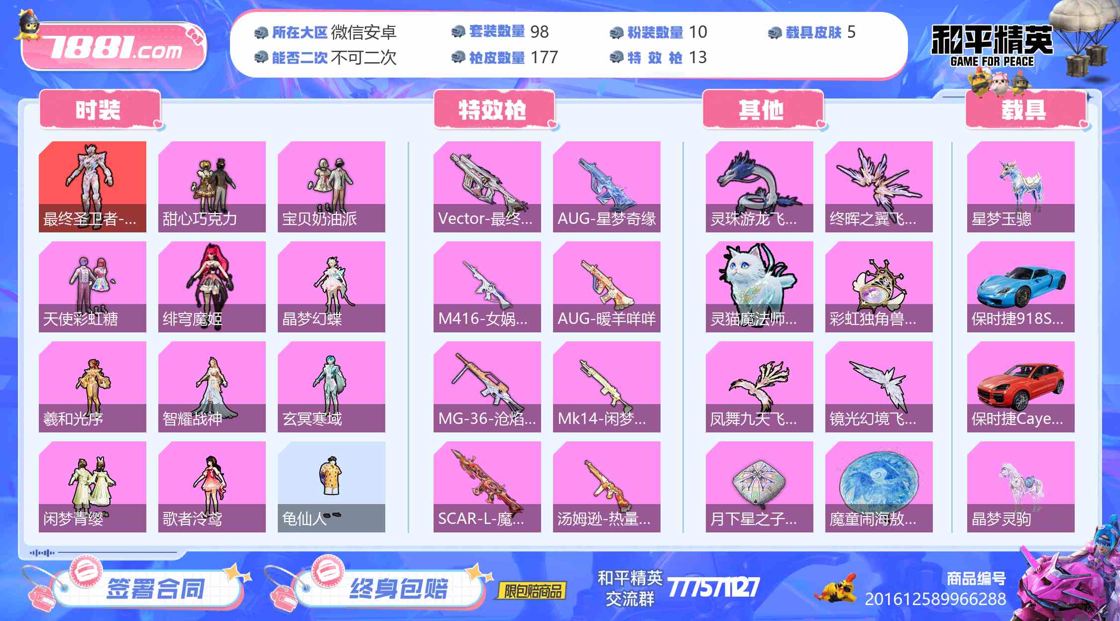 【王牌印记数量:3 套装数量:98 枪皮数量:177 粉装数量:10 特效枪数量:13 角色神装:1个 最终圣卫者-帕修斯 优质套装:绯穹魔姬,智耀战神,晶梦幻蝶,羲和光序,玄冥寒域,闲梦青缨,歌者泠鸢