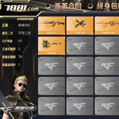 【V1 王者武器V数量:2 英雄武器V数量:76 王者武器:王者之魂,王者之心 特殊武器:4个 98K-星神,AN94-赳赳秦师,刑天战斧,巴雷特-朱雀 角色:1个 】2英雄角色数-76英雄武器数 【王者系列】:王者之心,王者之魂