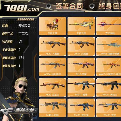 【V1 王者武器V数量:2 英雄武器V数量:171 王者武器:王者之蝶,王者之狱 角色:1个 】挂牌出售