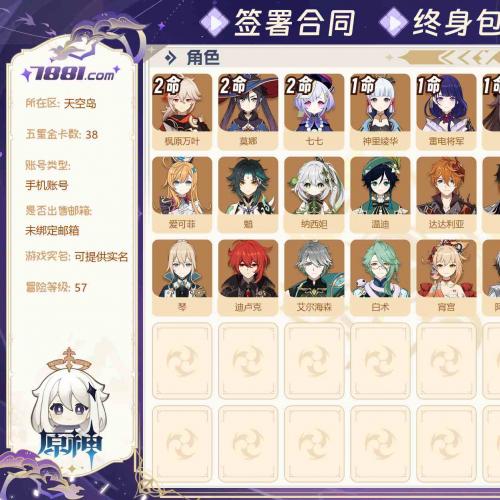 【等级:57 金卡数量:38 五星角色:21个 2命七七,2命莫娜,2命枫原万叶,1命胡桃,1命神里绫华,1命雷电将军,1命流浪者,0命迪卢克,0命琴,0命温迪,0命钟离,0命达达利亚,0命魈,0命宵宫,0命申鹤,0命提纳里
